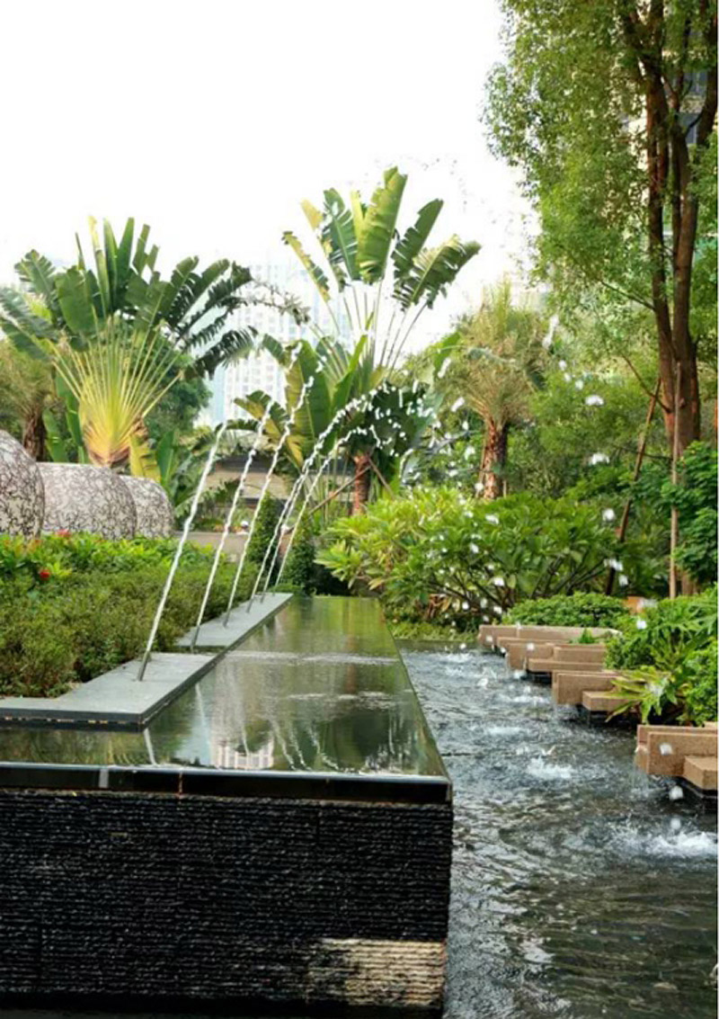 整个园林布局融合西式秩序与东方礼仪自东向西的四道叠级园林,超大无边界泳池、亭台、大片开阔草地、喷泉、小品、修剪几何形体的绿篱,看似随意却富有韵律的小路,全都是完全的中轴对称。