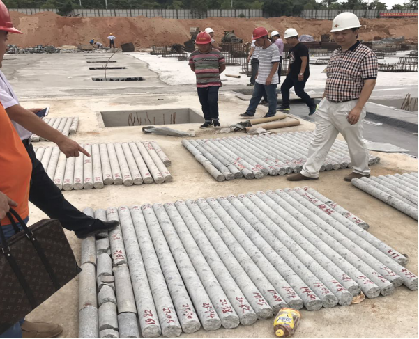 考察小组通过对设计桩的成桩过程观察,并与其它类型的灌注桩进行比较后,无论是用时长短,还是成桩过程中对周边环境的影响等方面,螺杆灌注桩都更胜一筹。另外,通过观察已完成抽芯检测的螺杆灌注桩,发现因在钢筋笼放置过程中有振捣器对桩身砼进行充分振捣,该工艺桩型混凝土芯样均连续、完整,表面光滑、胶结好,骨料分布均匀,且芯样侧面几无小气孔,成桩质量优良。