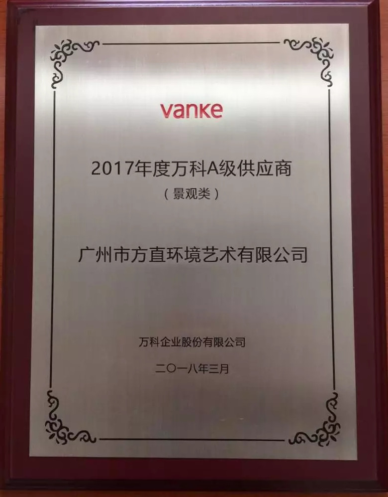 2018年3月荣获2017年度万科A级供应商(景观类)