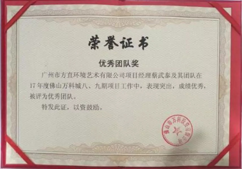 2018年1月荣获2017年度优秀团队(佛山万科城八、九期)