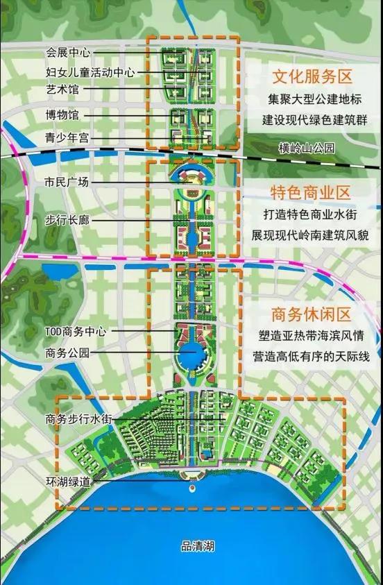 汕尾城市中轴线以汕尾高铁站为起点,沿着中轴西路(建设中)、站前横路、汕尾大道等城市主干道向四周延伸,一直延伸至品清湖。